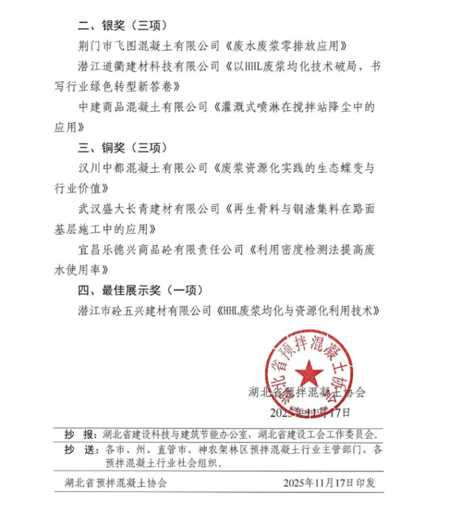 11月18日,好消息从湖北省预拌混凝土协会传来,在“砼五兴杯”企业绿色生产成果评选中,经过资质审核、现场核查、专家评审等多轮考评,